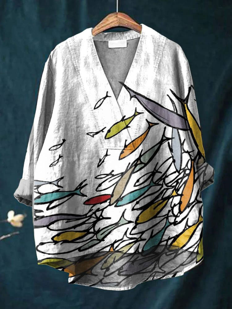 Women's Ocean Fish Art Print Casual Cotton And Linen V-neck Shirt