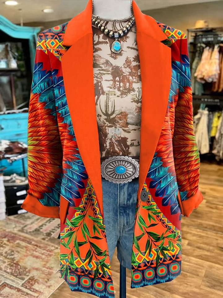 Women's Vintage Flower Contrast Print 3/4 Sleeve Casual Blazer