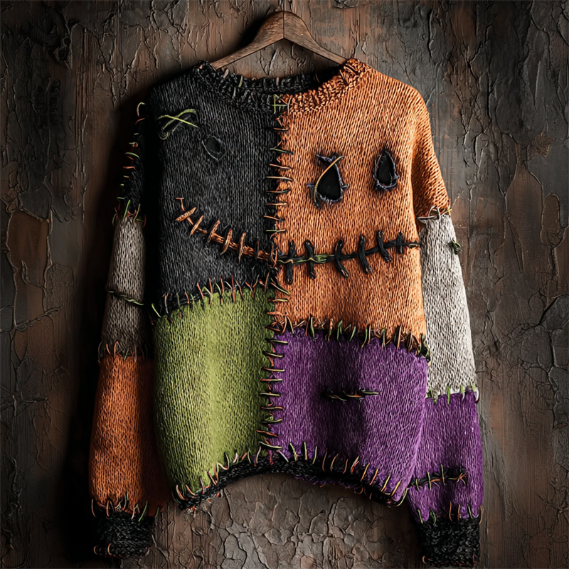 Halloween Stitched Face Colorblock Cozy Knit Sweater