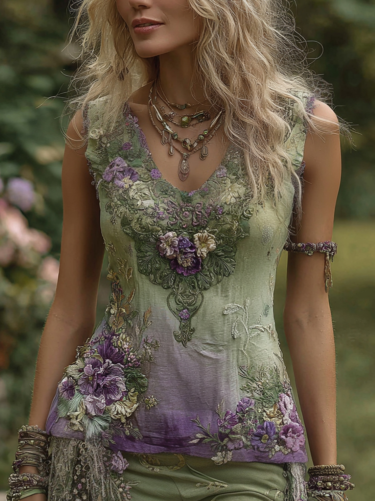 Vintage Floral Embroidered V-neck Linen Blend Tank Top