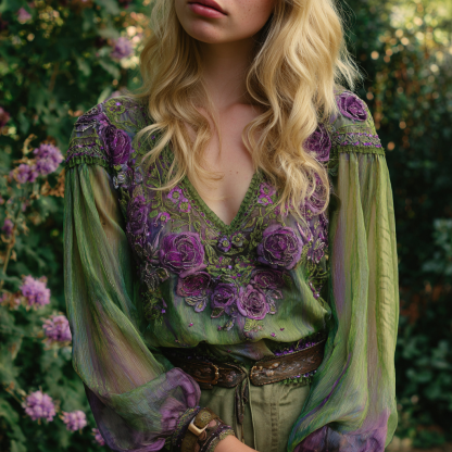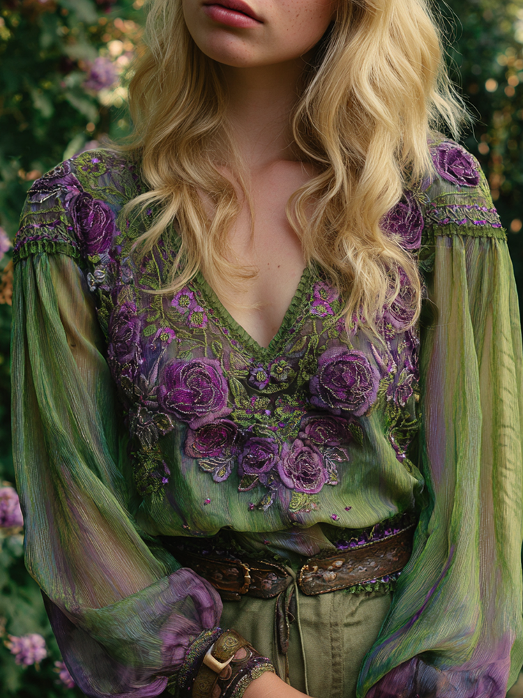 Vintage Purple Rose Embroidery Linen V Neck Long Sleeve Shirt
