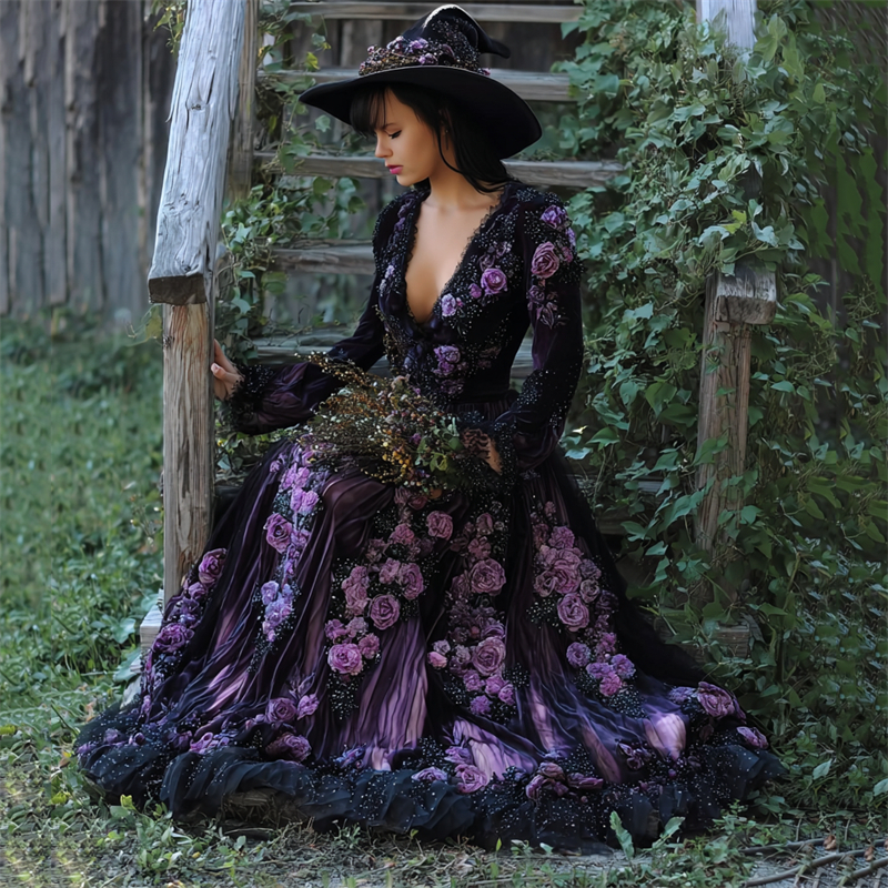 Vintage Witch Purple Roses Glitter Embroidered Wide Skirted Dress