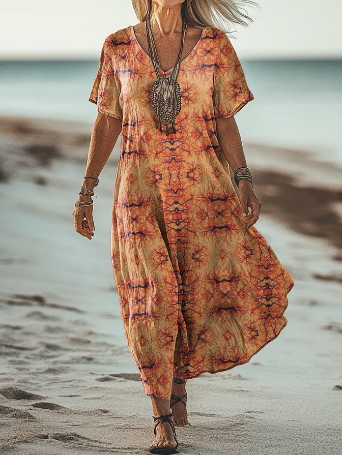 Women's Art Floral Hippie Vintage Print V Neck Dress