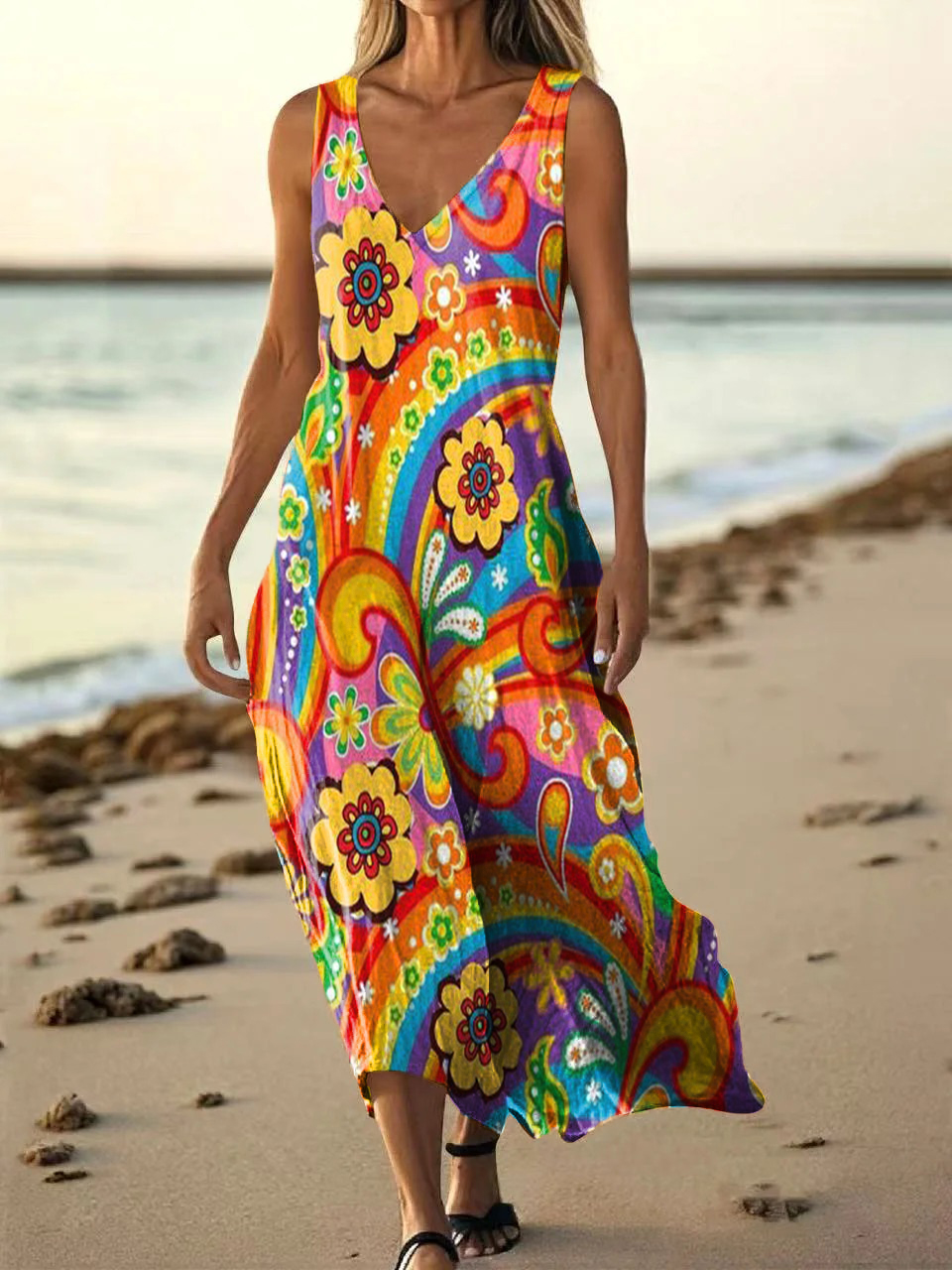 Women's Rainbow Hippie Flower Power Art Print Pocket V Neck Cotton Dress