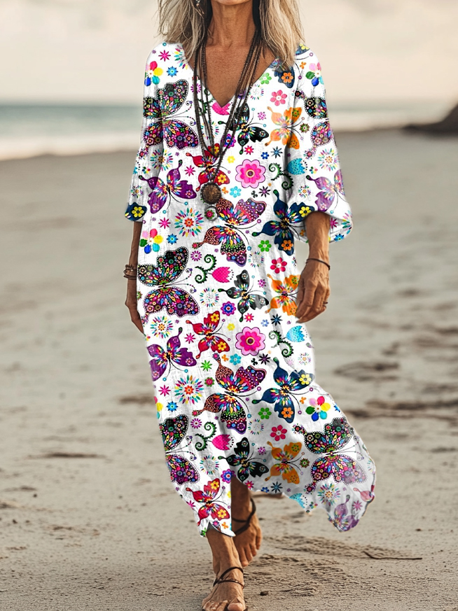 Women's Vintage Butterfly Art Print Pocket Cotton Dress