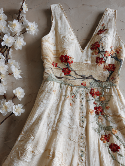 Women's Vintage Cherry Blossom Embroidery Marble Pattern Sleeveless Midi Dress