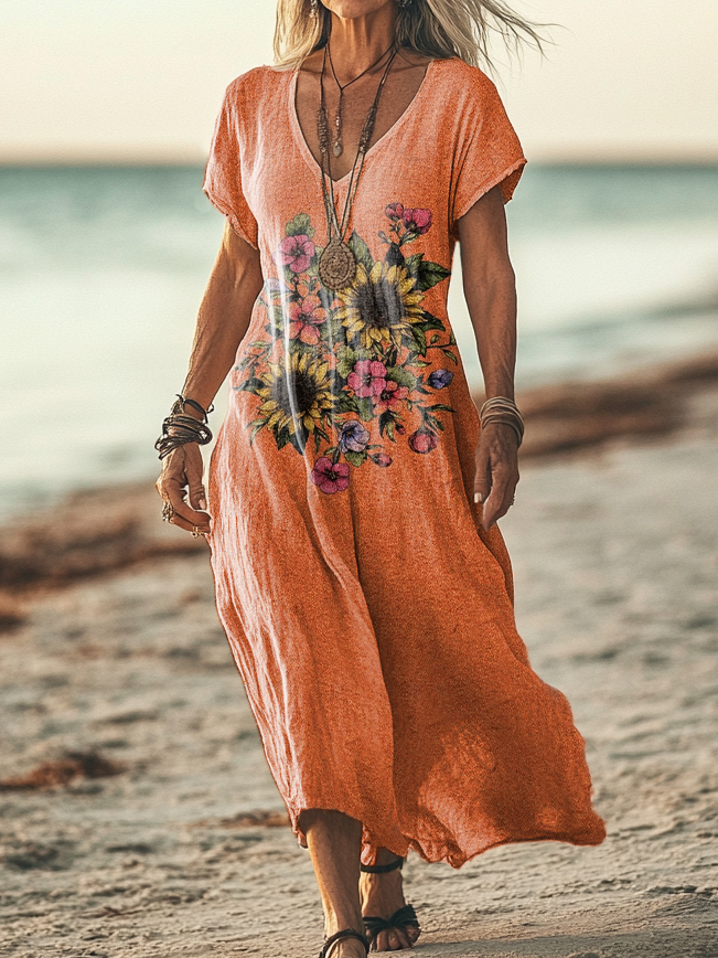 Women's Vintage Floral Art Print Pocket Cotton Dress