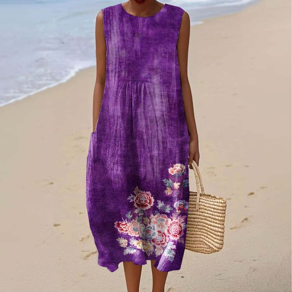 Women's Vintage Floral Art Print Sleeveless Cotton Pocket Wrap Dress