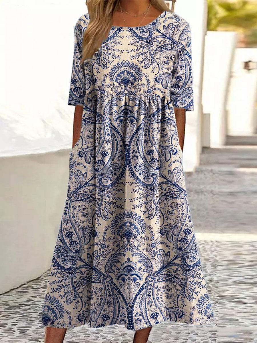 Women's Vintage Flower Art Print Pocket Cotton Dress