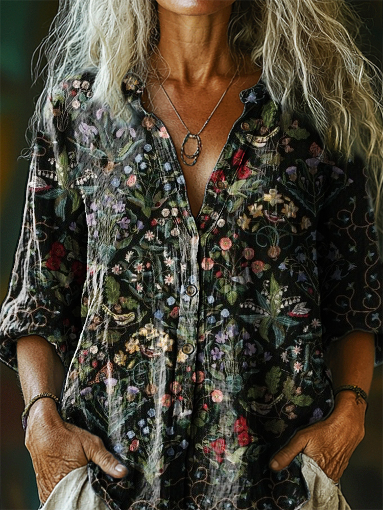 Women's Vintage Floral Butterfly Art Print Casual Cotton Linen Shirt