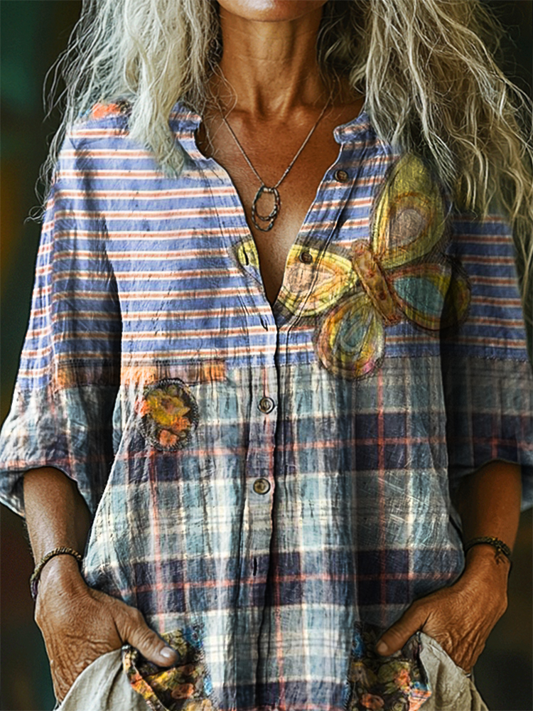 Women's Vintage Butterfly Patchwork Art Print Casual Cotton Linen Shirt
