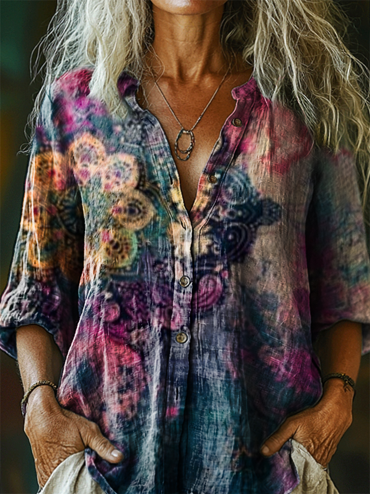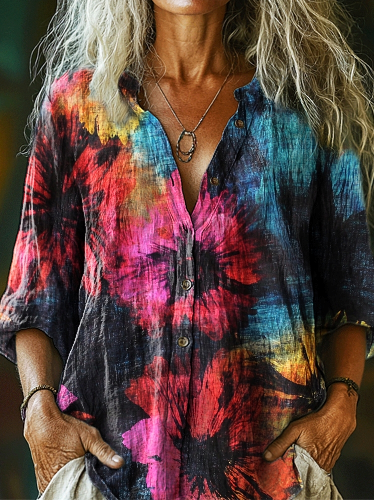 Women's Colorful Tie-dye Flower Art Print Casual Cotton Linen Shirt