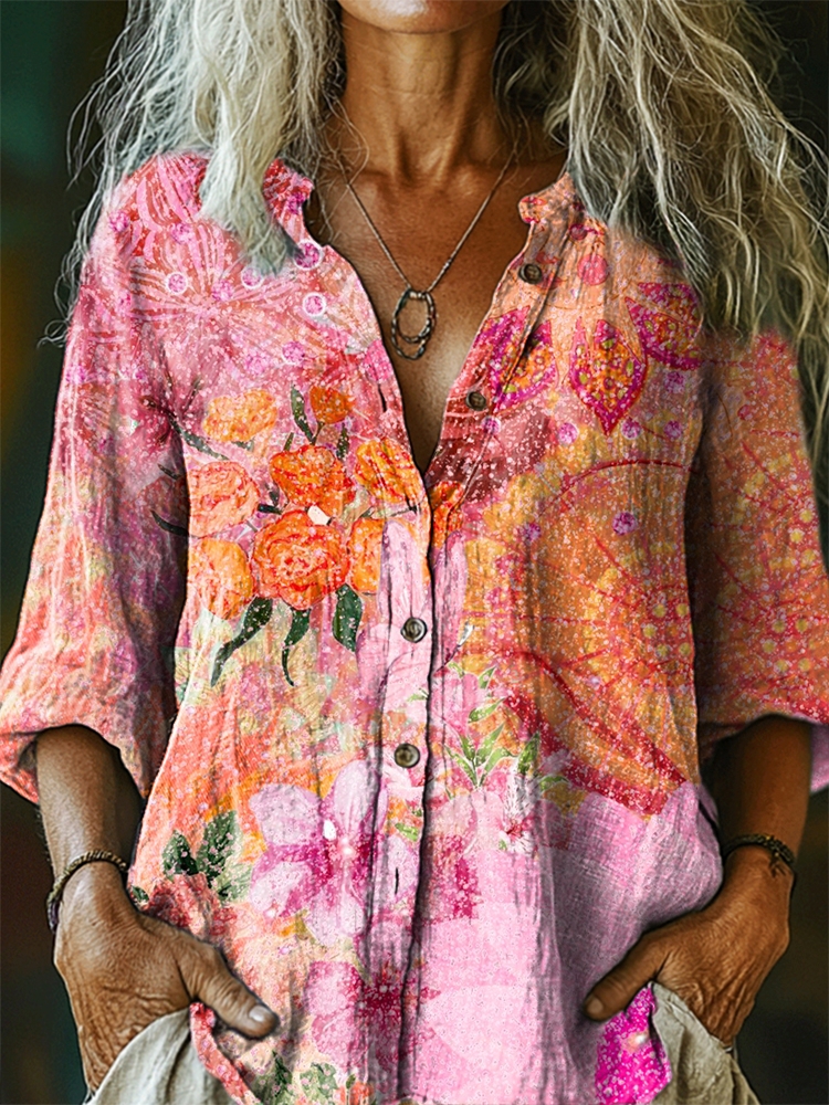 Women's Bohemian Floral Art Print Casual Cotton Linen Shirt