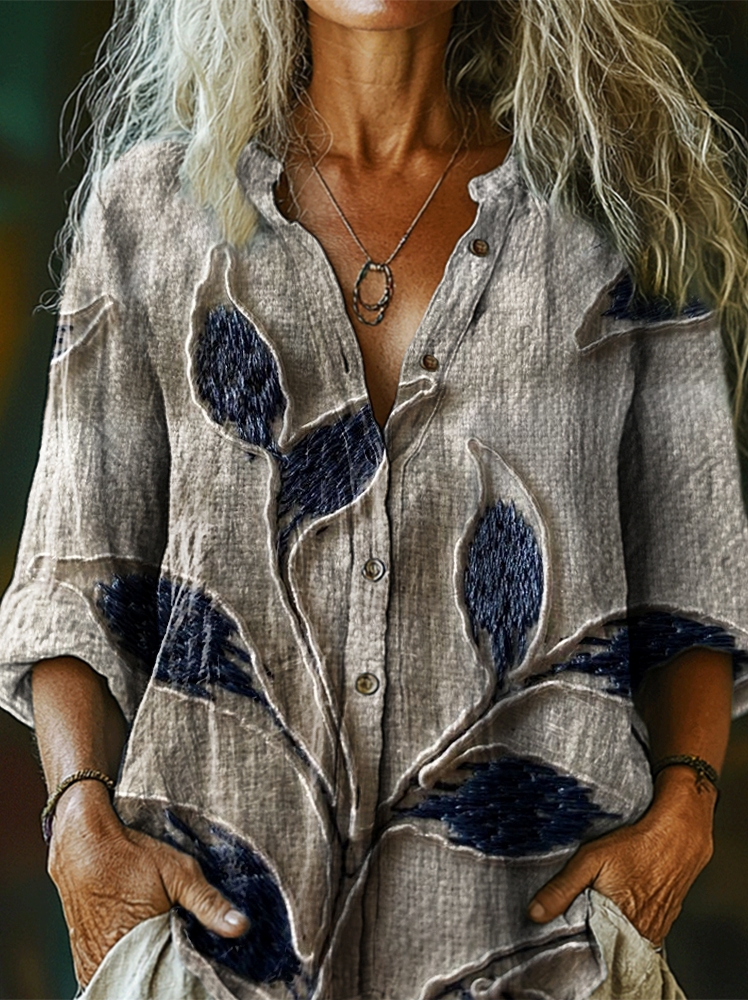 Women's Vintage Leaf Texture Art Print Casual Cotton Linen Shirt