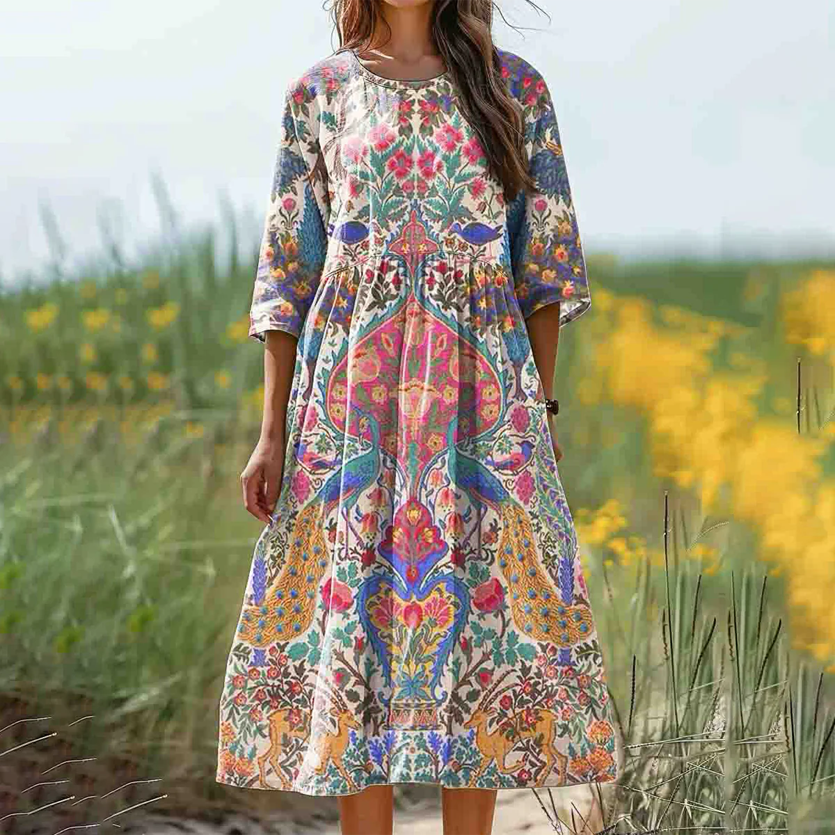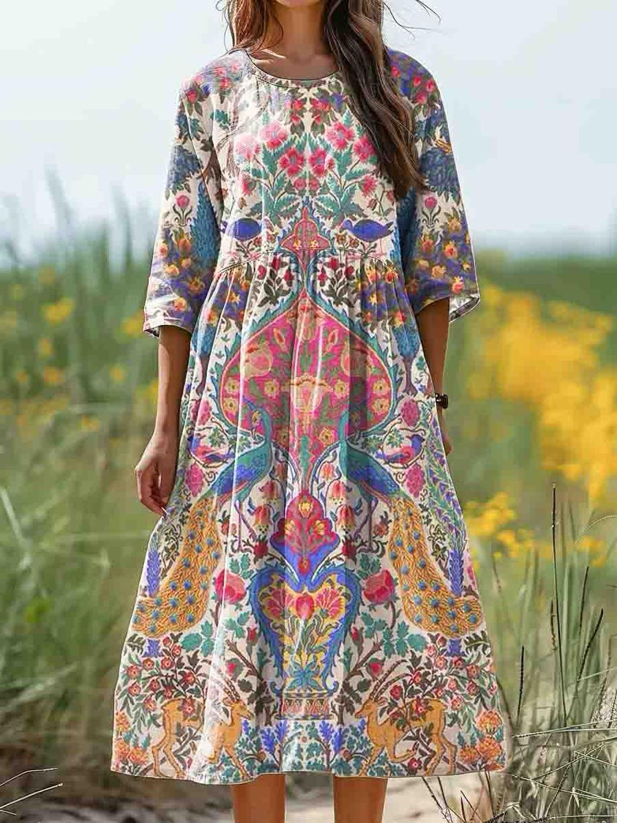 Chic Round Neck 3/4 Sleeve Midi Dress