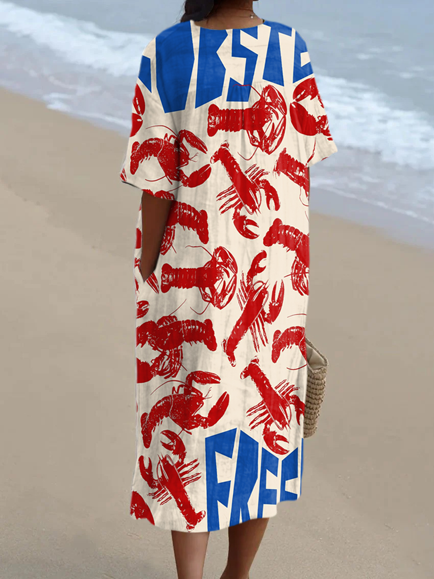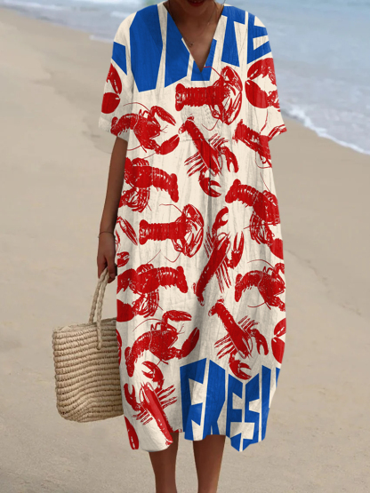 Fresh Lobster Art Casual V-Neck Midi Dress