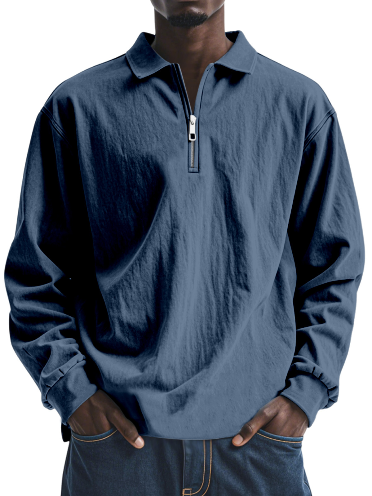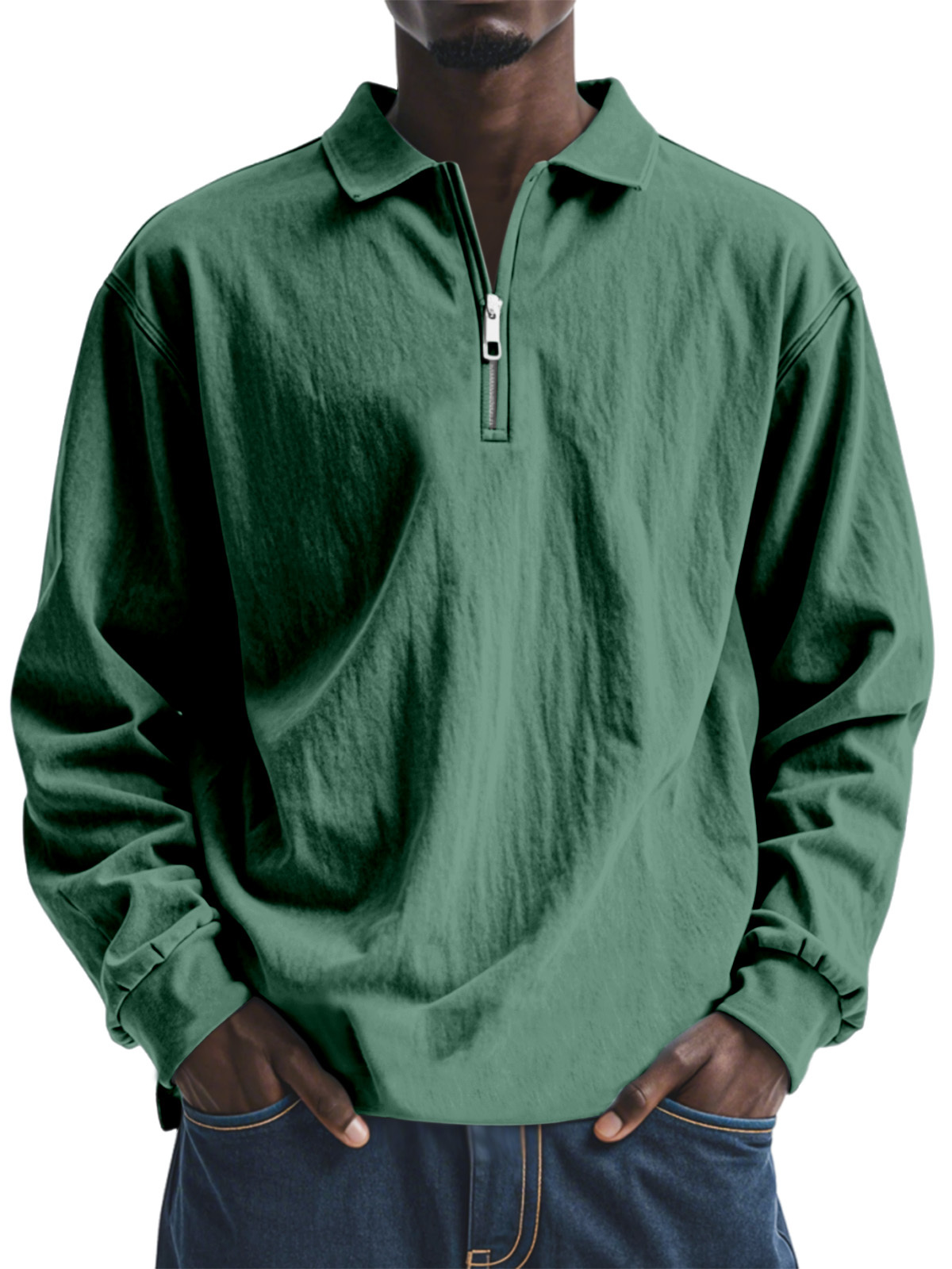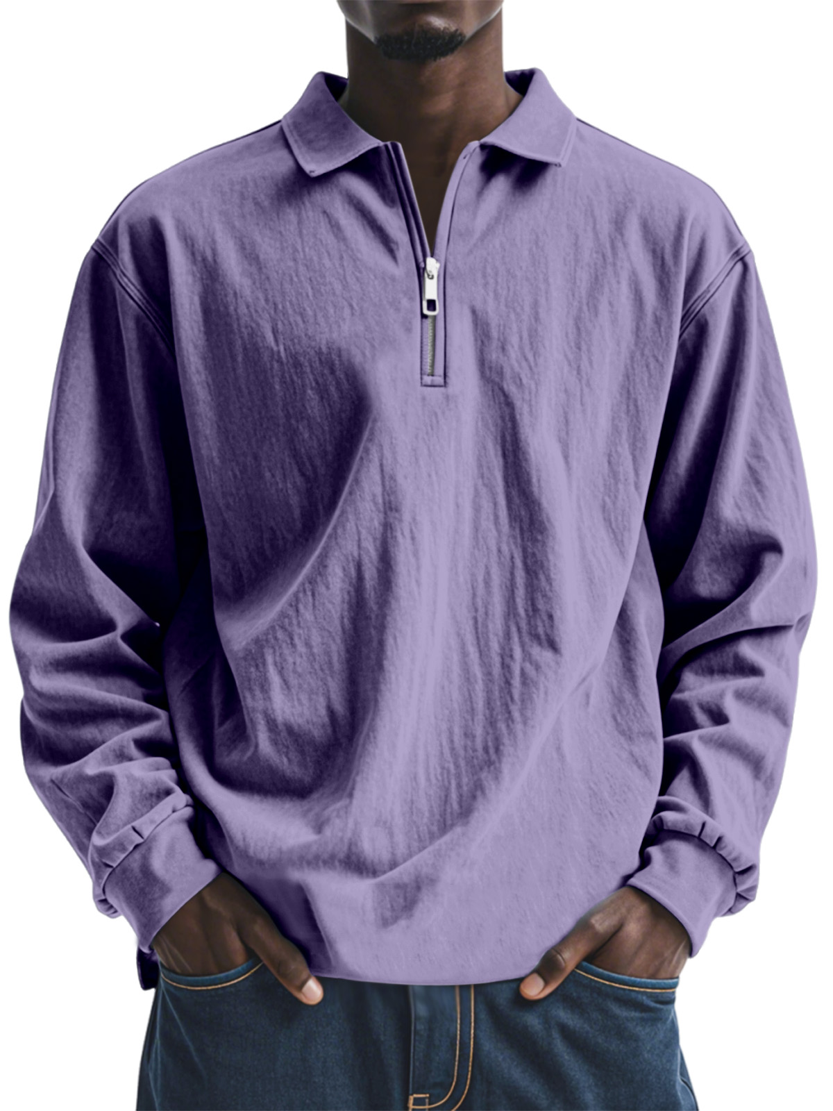 Men's Casual Solid Color Lapel Zipper Long Sleeve Polo Shirt