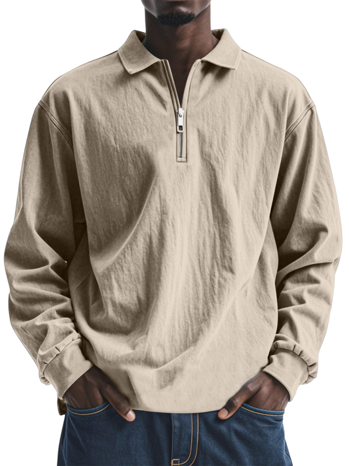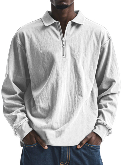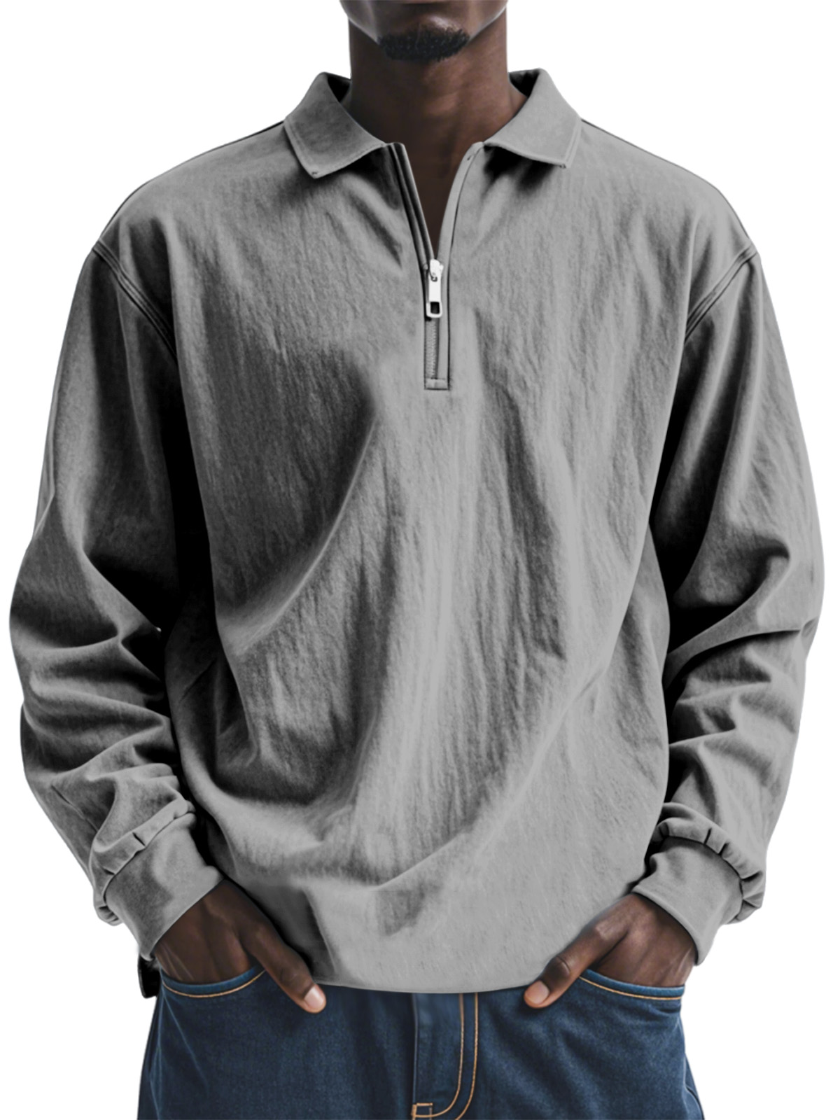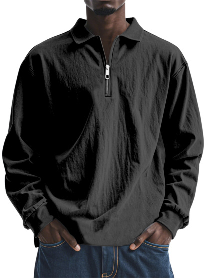 Men's Casual Solid Color Lapel Zipper Long Sleeve Polo Shirt