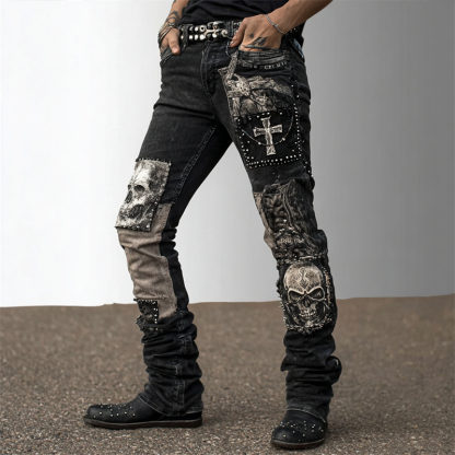 Men's Rock Style Skulls & Cross Studded Patch Stretchy Jeans