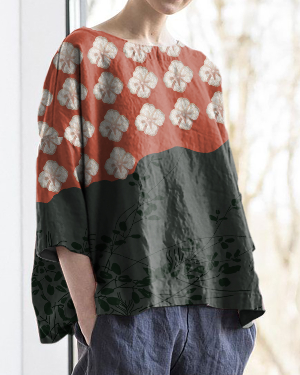Retro Japanese Art Print Round Neck Cotton and Linen Loose Top