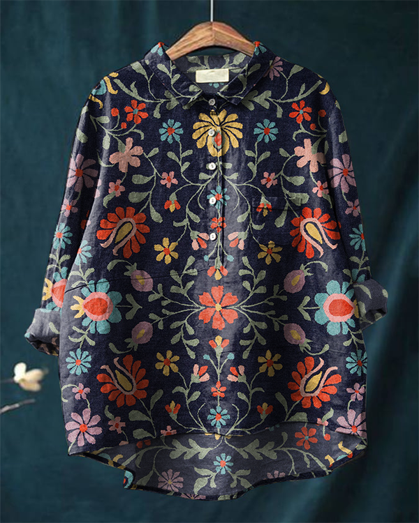 Retro Ethnic Floral Print Casual Cotton and Linen Long-sleeved Shirt