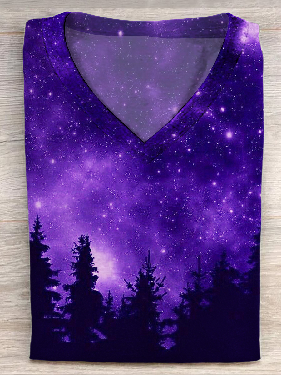 Unisex Starlit Sky Printed Vintage Fashion Loose V-Neck Short Sleeve T-Shirt