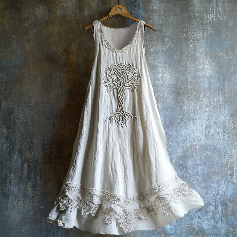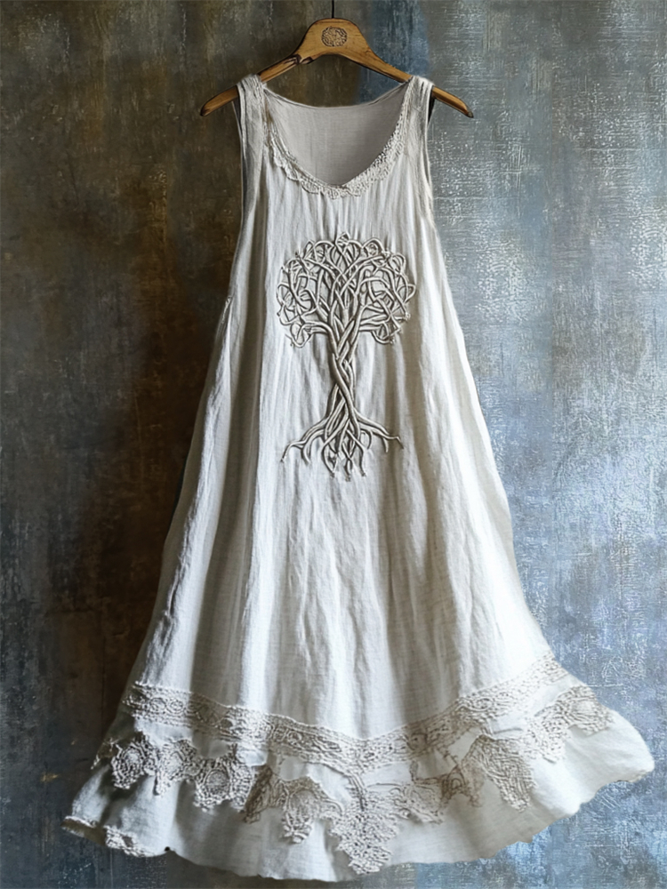 Viking Celtic Tree Of Life Lace Hem Layered Linen Dress