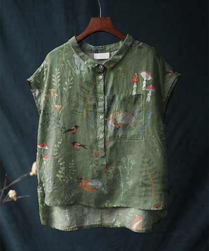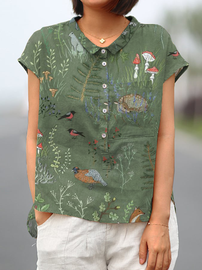 Vintage Animal Floral Print Cotton and Linen Casual Shirt