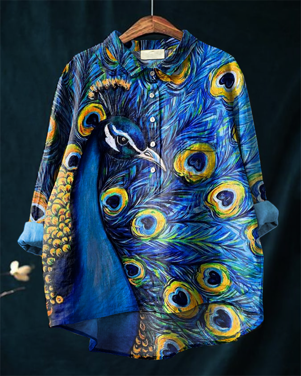 Vintage Peacock Art Casual Cotton and Linen Shirt