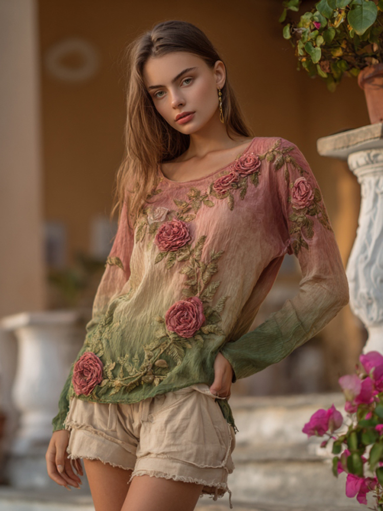 Vintage Pink Floral Embroidered Linen Shirt