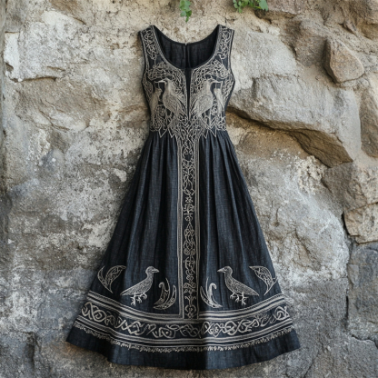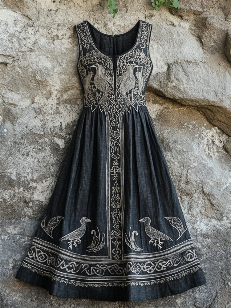 Vintage Viking Celtic Ravens Medieval Linen Maxi Dress