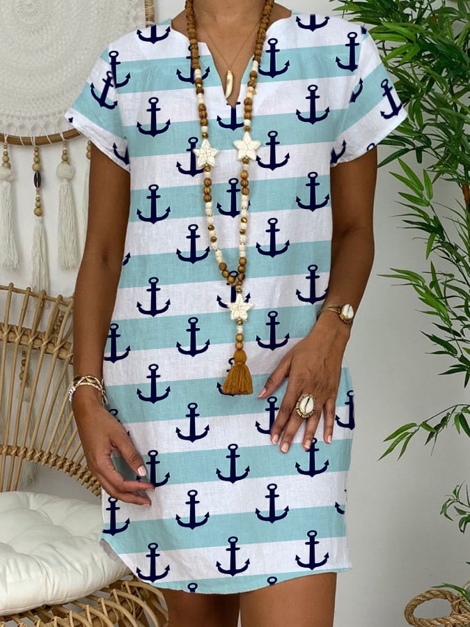 Women'S Boat Sight Print V Neck Short Sleeve Dress
