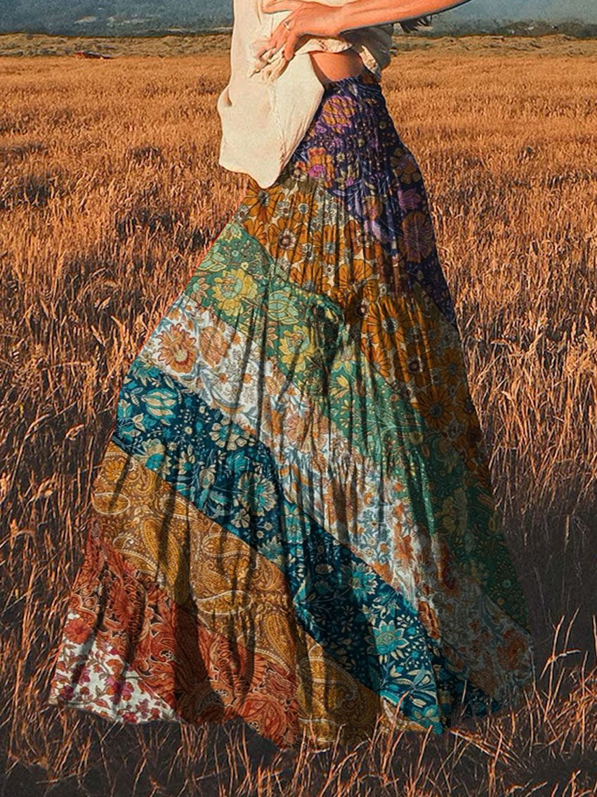 Women's Bohemian Patchwork Rainbow Print Cotton Pocket Skirt