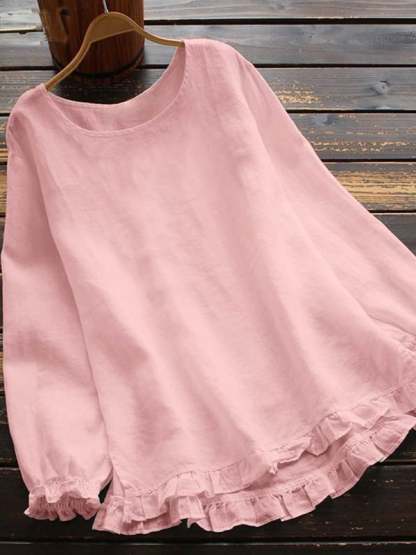 Women's Cotton Linen Solid Color Round Neck Long Sleeve Shirt