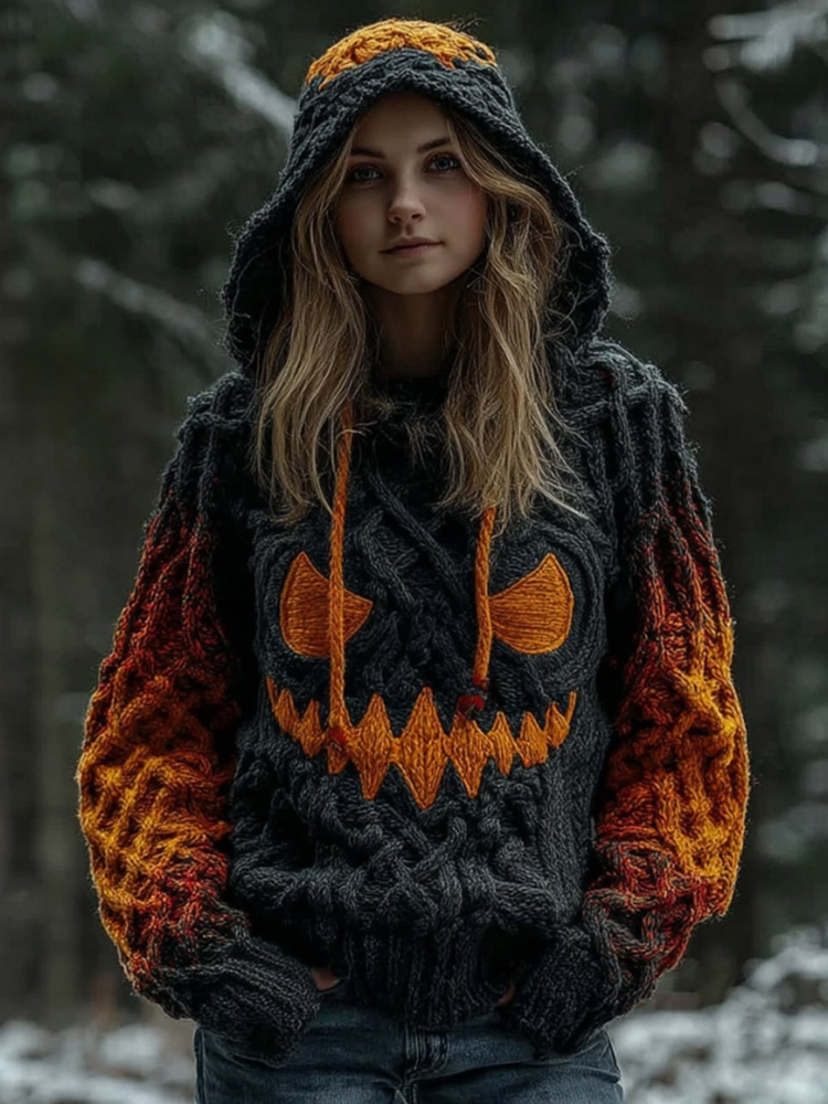 Women's Halloween Spooky Pumpkin Art Gradient Vintage Cozy Knit Hooded Sweater