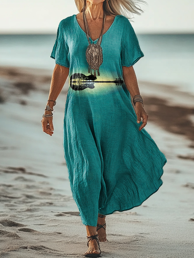 Women's Hippie Guitar Art Print Pocket Cotton Dress
