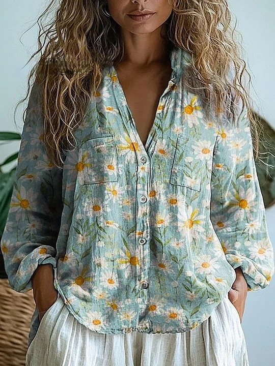 Women's Lovely Daisy Art Print Casual Long Sleeve Comfortable Cotton Shirt
