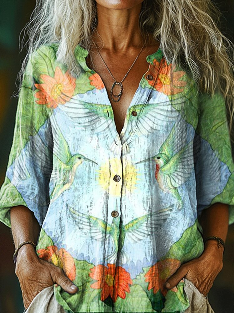 Women's Peak Bird Floral Pattern Art Print Casual Cotton Linen Shirt