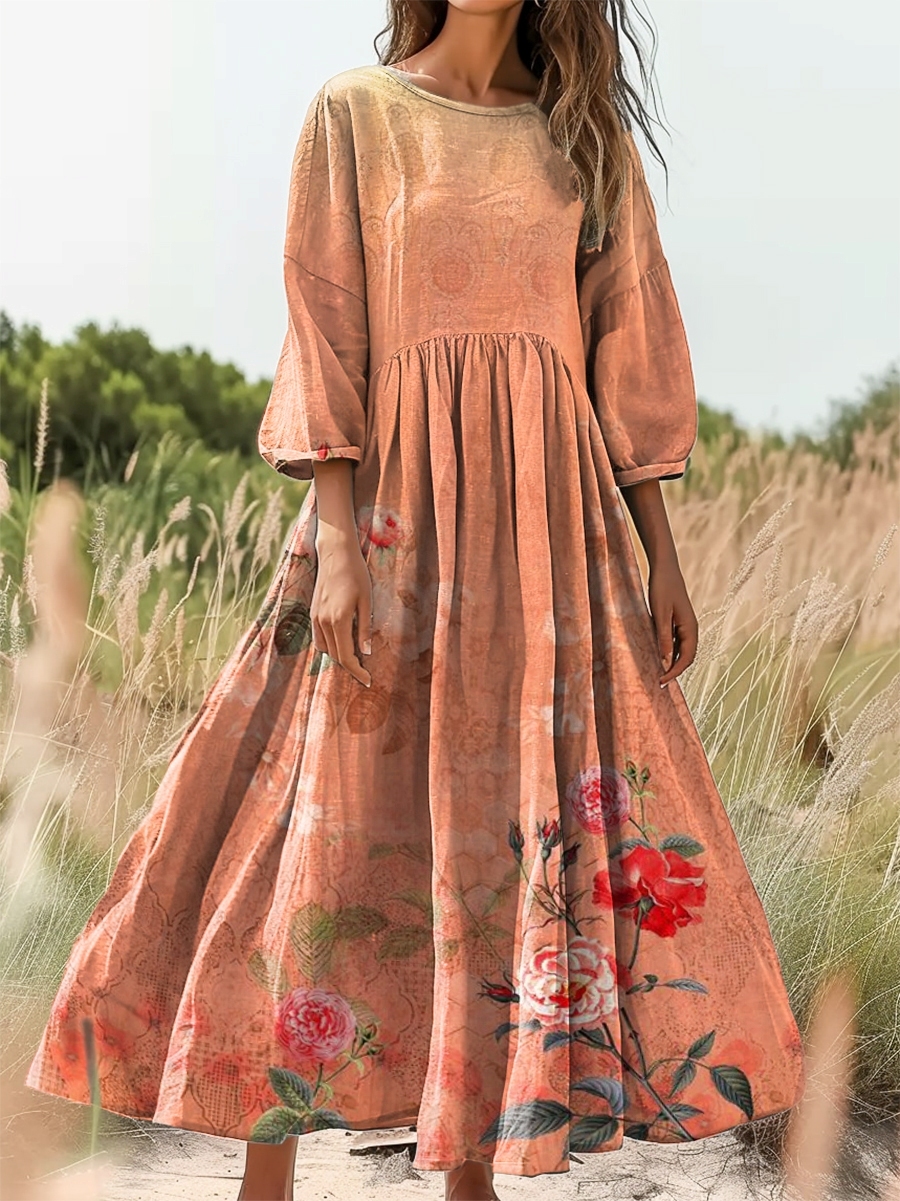 Women's Retro Ethnic Flowers Print Flowy Cotton Crew Neck Dress