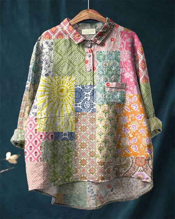 Women's Retro Stitching Floral Print Casual Cotton and Linen Shirt