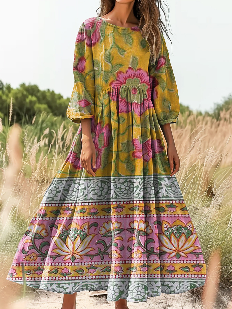 Women's Vintage Ethnic Floral Art Print Flowy Cotton Crew Neck Dress