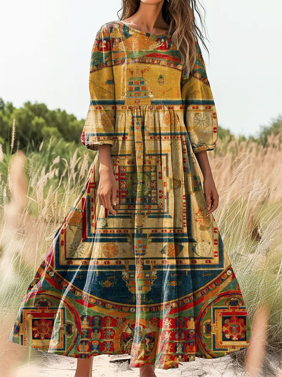 Women's Vintage Ethnic Floral Art Print Flowy Cotton Crew Neck Dress
