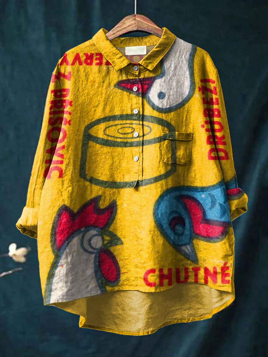 Women's Vintage Farm Animals Chicken Rooster Art Print Casual Cotton And Linen Shirt