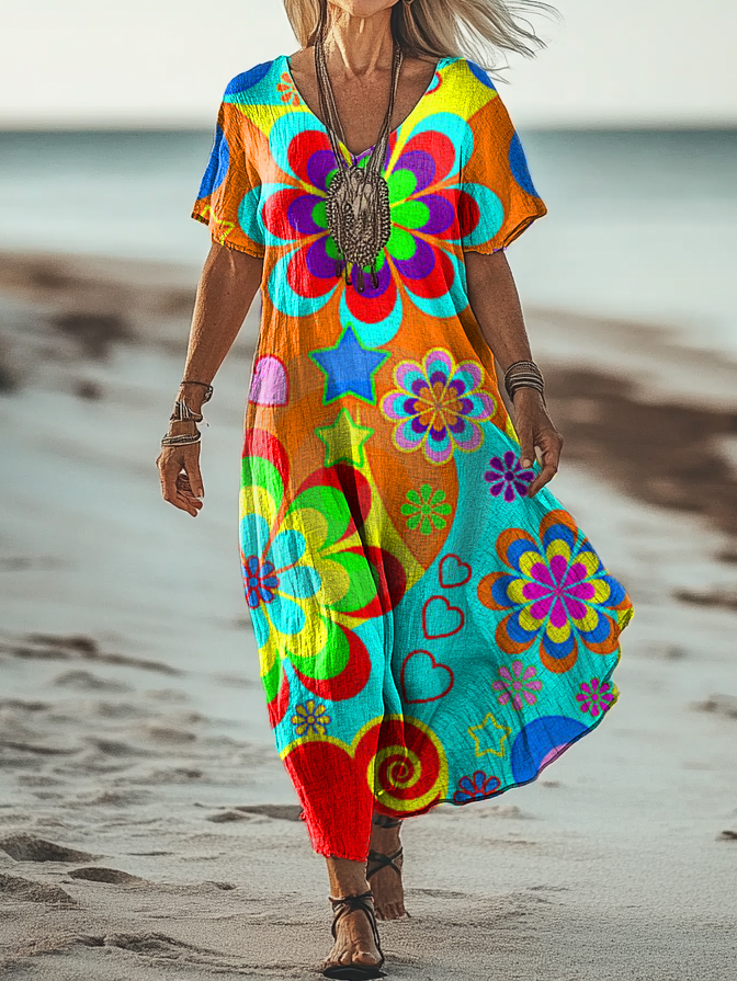 Women's Vintage Floral Art Print Pocket Cotton Dress