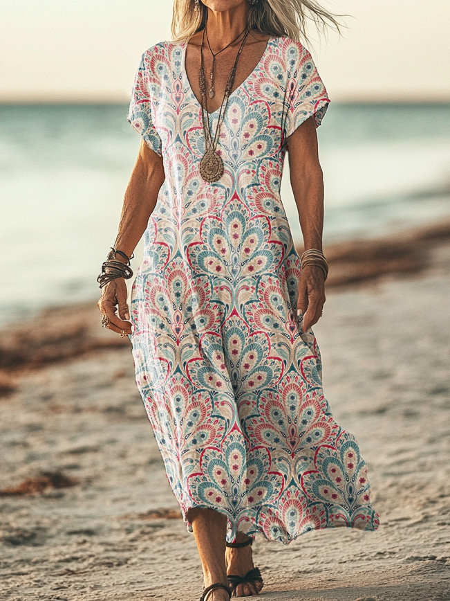 Women's Vintage Floral Art Print Pocket Cotton Dress