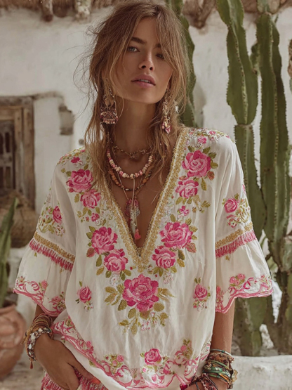 Women's Vintage Floral Embroidery Art V Neck Linen Comfy T-shirt