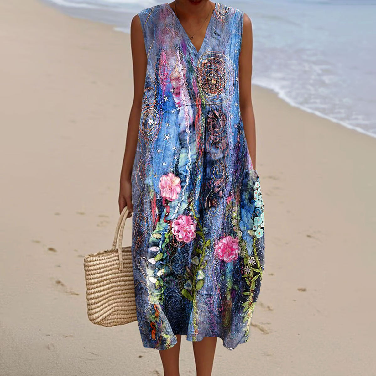 Women's Vintage Flower Art Print Sleeveless Cotton Pocket Wrap V Neck Dress