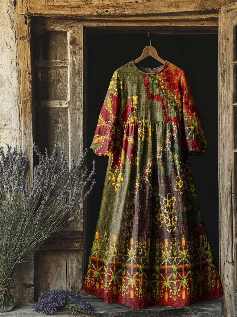 Women's Vintage Patchwork Flower Art Print Flowy Cotton Crew Neck Dress