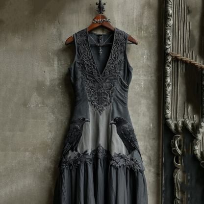 Women's Vintage Viking Raven Celtic Knot Linen Maxi Dress
