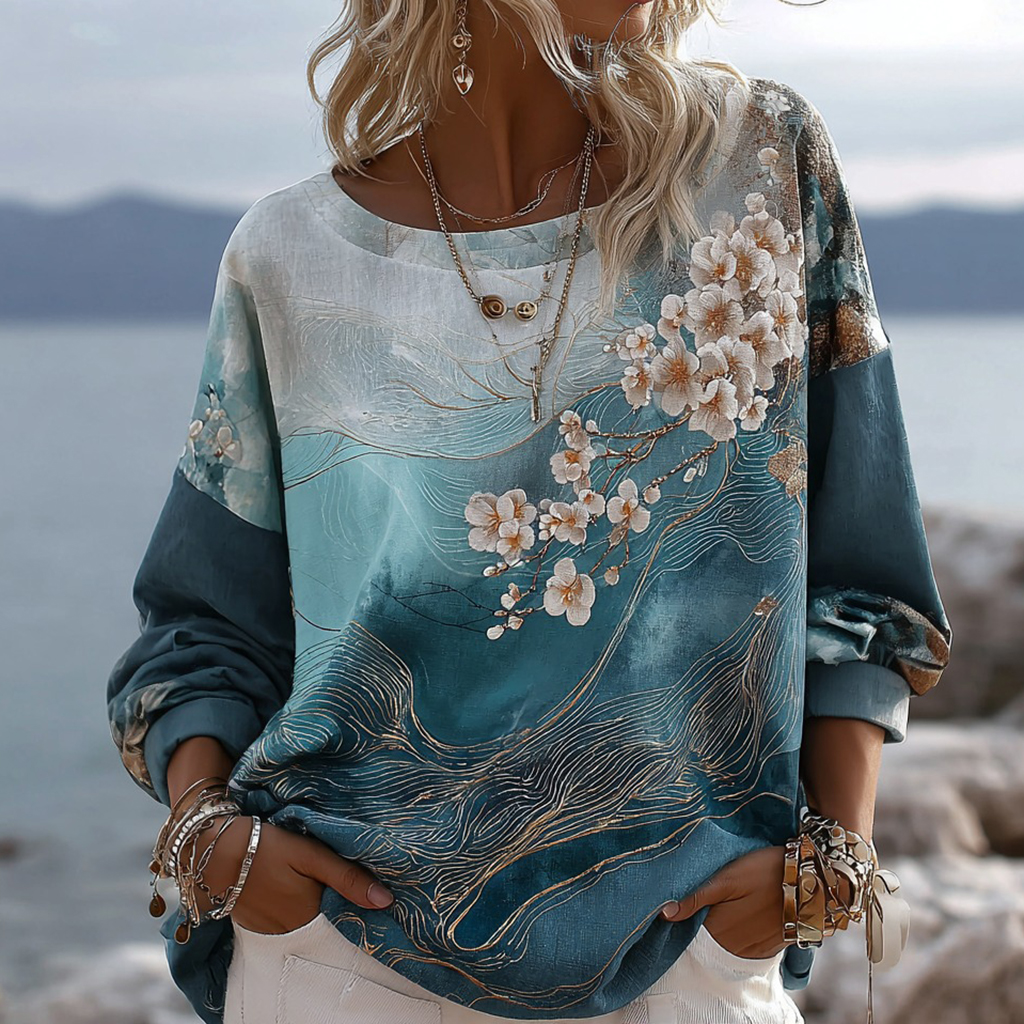 Oil Painting Irises Embroidered Contrast Flowy Linen Tunic
